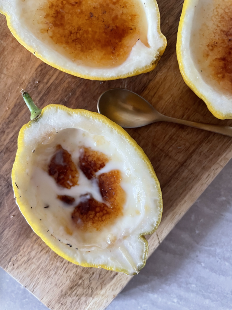 Ce qui se joue ici tient à une simplicité presque primaire, liée à la maternité et à l’enfance. Peu d’ingrédients, peu d’artifice, mais quelque chose de profondément délicat. Une douceur franche, rassurante à laquelle se mêle une légère amertume. Une pointe végétale, discrète, comme un souvenir qui affleure. Et surtout, ce voile brûlé à la surface : une fine couche de sucre craquant, marquée par la chaleur, comme la brûlure laissée par le deuil. Une carapace fragile, qu’il faut briser pour atteindre ce qui reste tendre en dessous. Autant d’éléments pour raconter Agnes à travers une recette, celle du Lemon Posset.