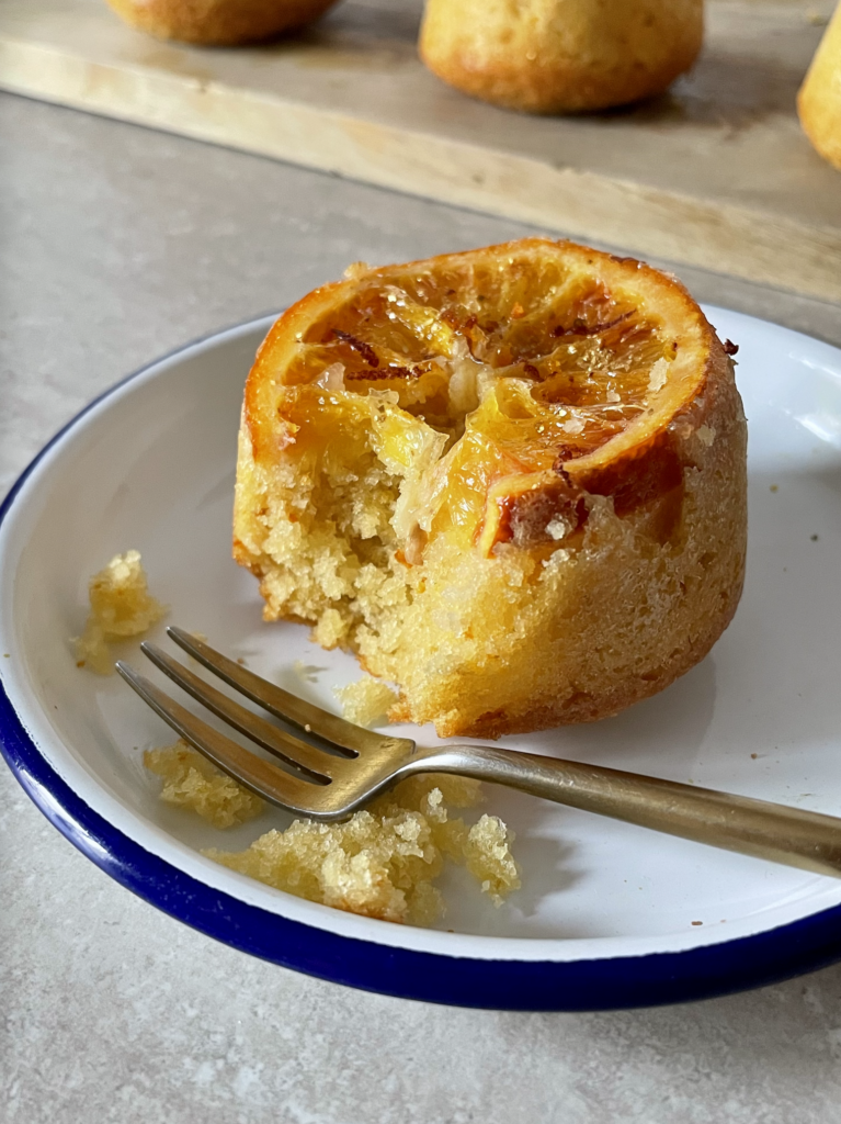 Préchauffez le four à 170 °C, huilez 8 moules individuels et chemisez le fond de papier cuisson, disposez une tranche d’orange dans le fond de chaque cavité, recouvrez avec l’appareil et enfournez 35 minutes. Démoulez encore chaud en retournant : les oranges apparaissent, brillantes, sanguines… le genre de renversement que Marty apprécierait.