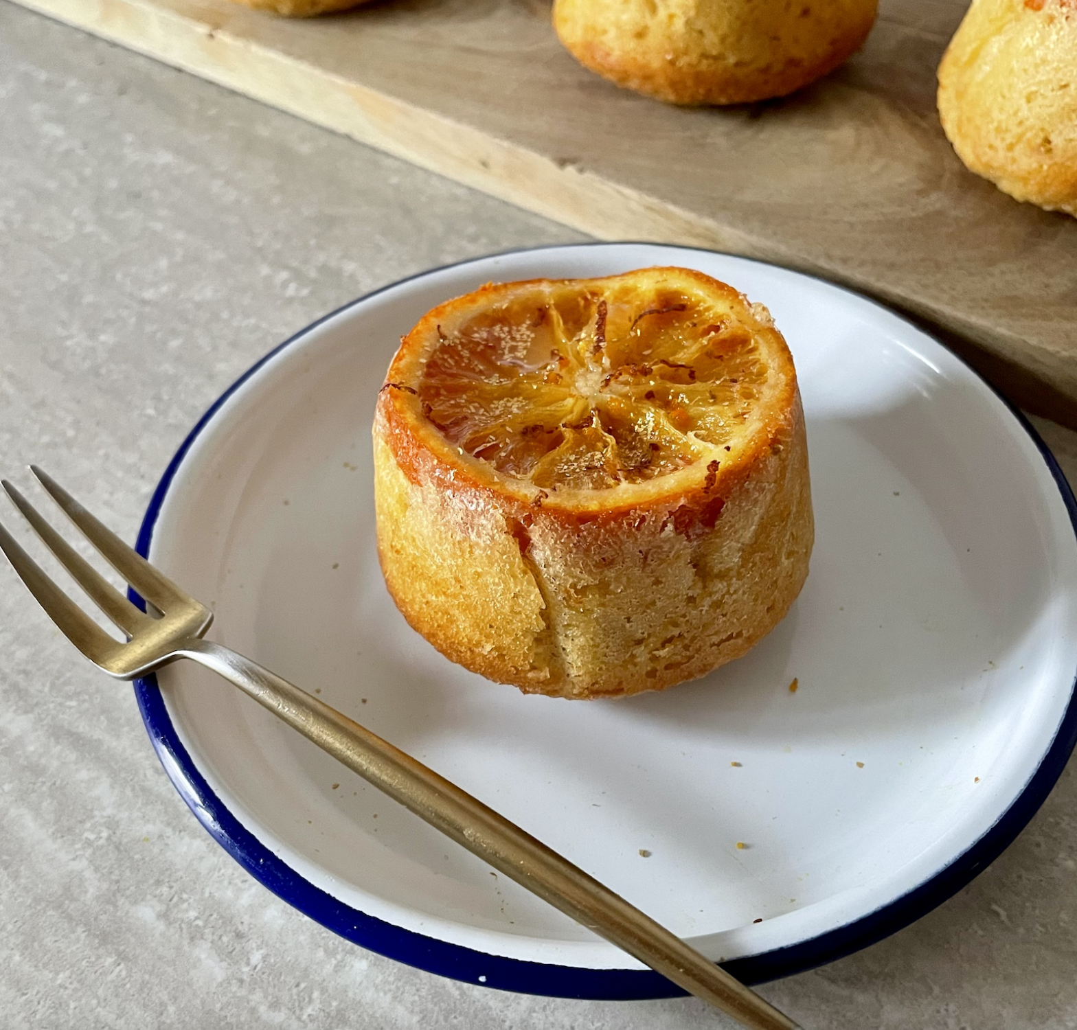 Préchauffez le four à 170 °C, huilez 8 moules individuels et chemisez le fond de papier cuisson, disposez une tranche d’orange dans le fond de chaque cavité, recouvrez avec l’appareil et enfournez 35 minutes. Démoulez encore chaud en retournant : les oranges apparaissent, brillantes, sanguines… le genre de renversement que Marty apprécierait.