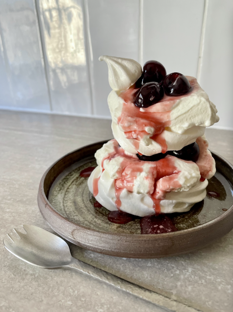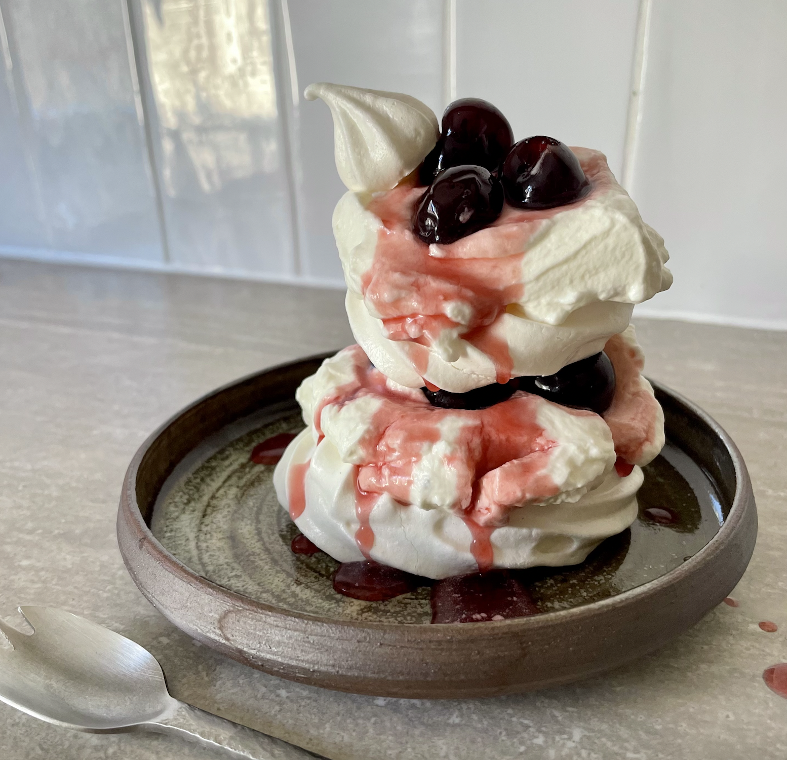 Il est temps d’assembler la pavlova qu’on imaginera comme une pièce montée à la fois gothique et décadente : un disque de meringue, une généreuse cuillère de chantilly, quelques cerises. Répétez l’opération, abusez du sirop de cerise, n’hésitez pas à faire tanguer la pièce. Rien n’est parfait, tout se craquèle, monstrueusement délicieux.