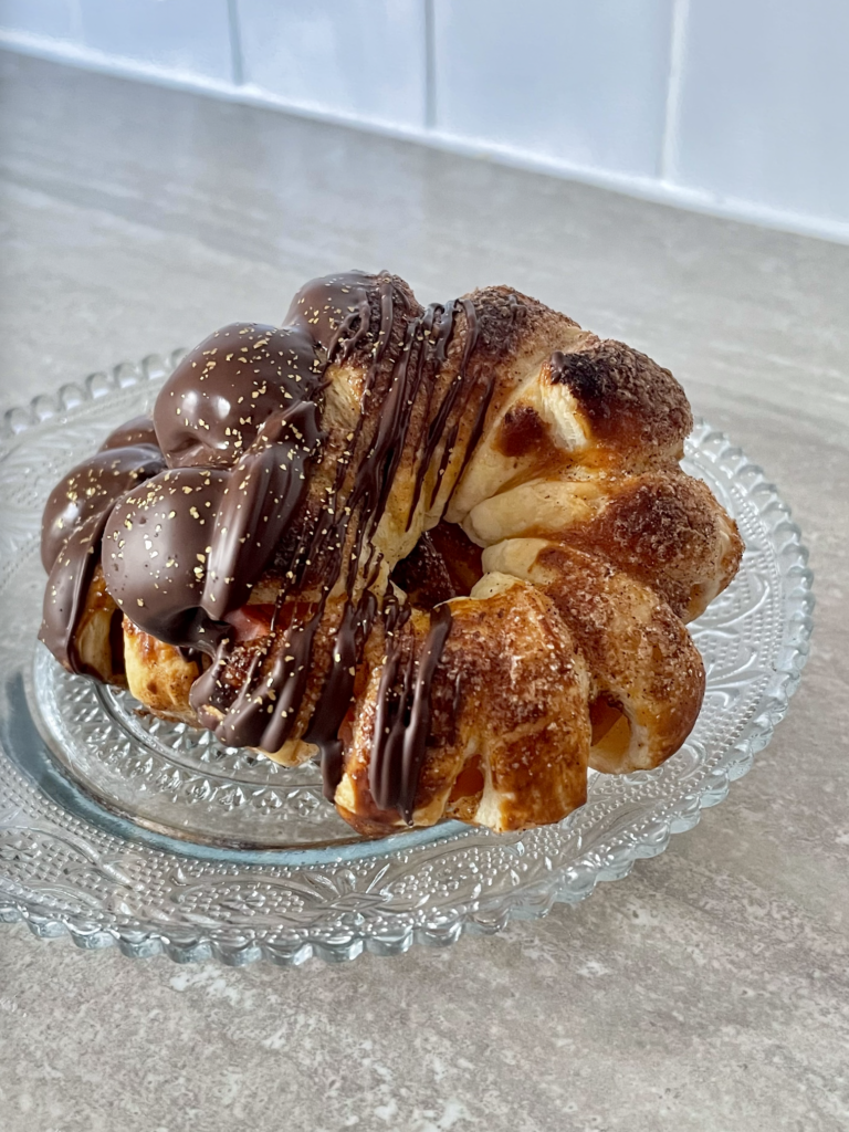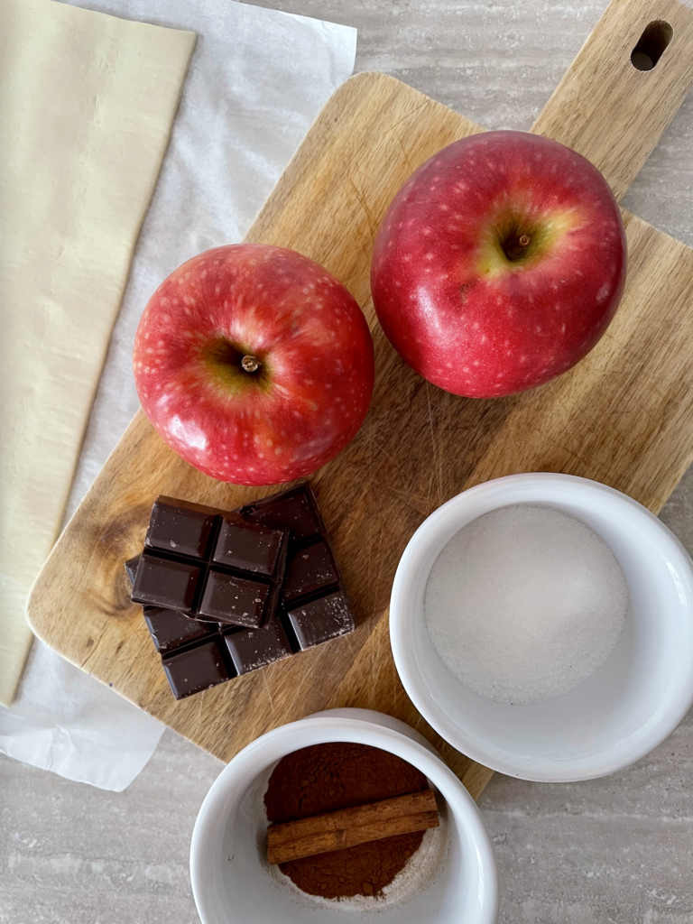 Coupez vos pommes en rondelles, évidez le coeur. Plongez dans le mélange sucre/cannelle. Taillez des bandes dans votre pâte et entourez les anneaux fruités de ce feuilletage. Badigeonnez d’un jaune d’oeuf, saupoudrez du mélange sucre/cannelle et mettez au four 15min à 180°C.