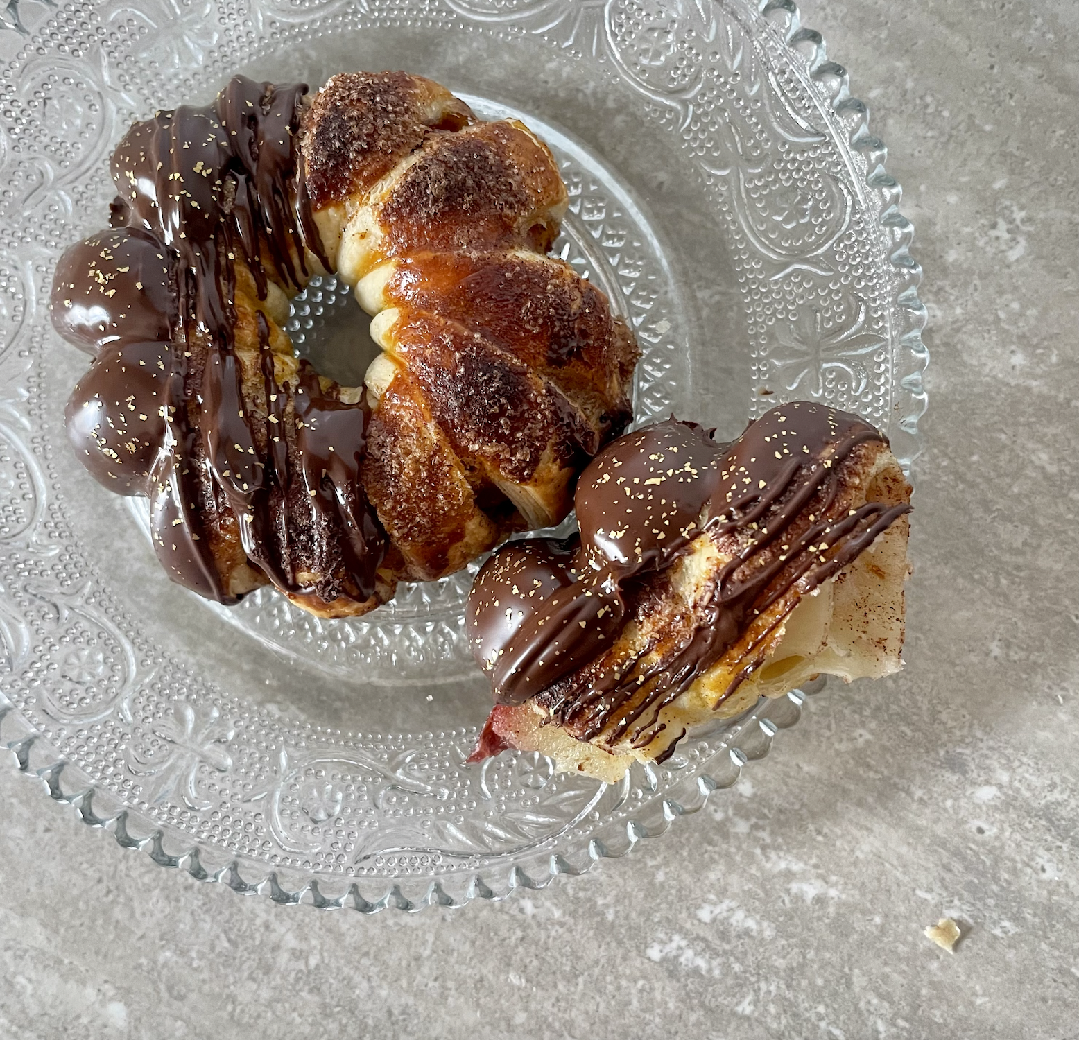 Coupez vos pommes en rondelles, évidez le coeur. Plongez dans le mélange sucre/cannelle. Taillez des bandes dans votre pâte et entourez les anneaux fruités de ce feuilletage. Badigeonnez d’un jaune d’oeuf, saupoudrez du mélange sucre/cannelle et mettez au four 15min à 180°C.